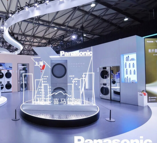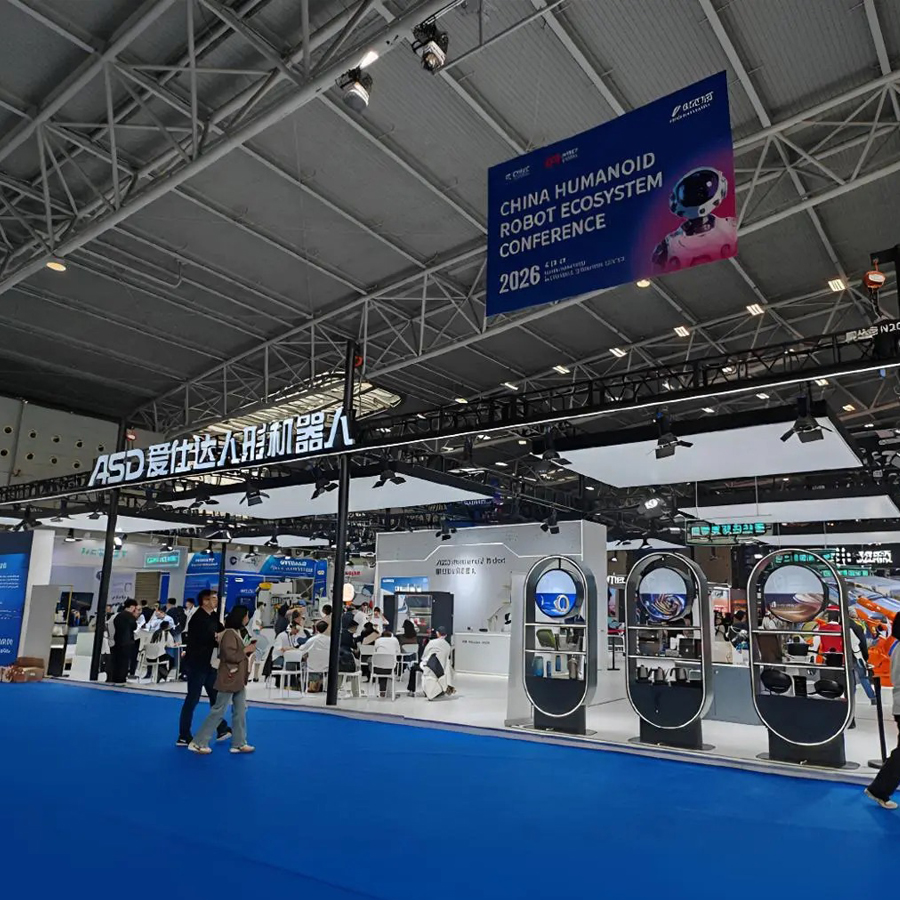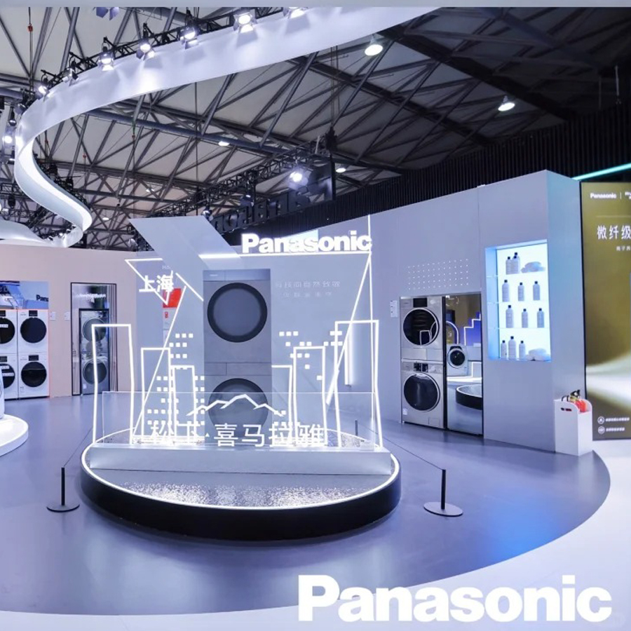 The exhibits are neatly and orderly arranged, highlighting key products. The lighting, video display screens, and backdrop are all appropriately set up.